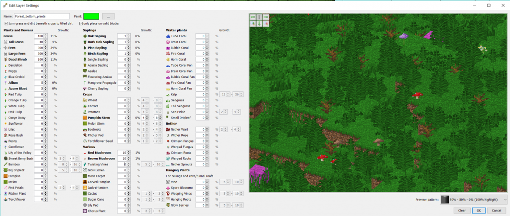First some plants which i expect to find on the ground in a forest. The values are only based on what i visually like in the preview. Mostly i want ferns, some mushrooms and then some sprinkeled extras like pumpkin and flowers.